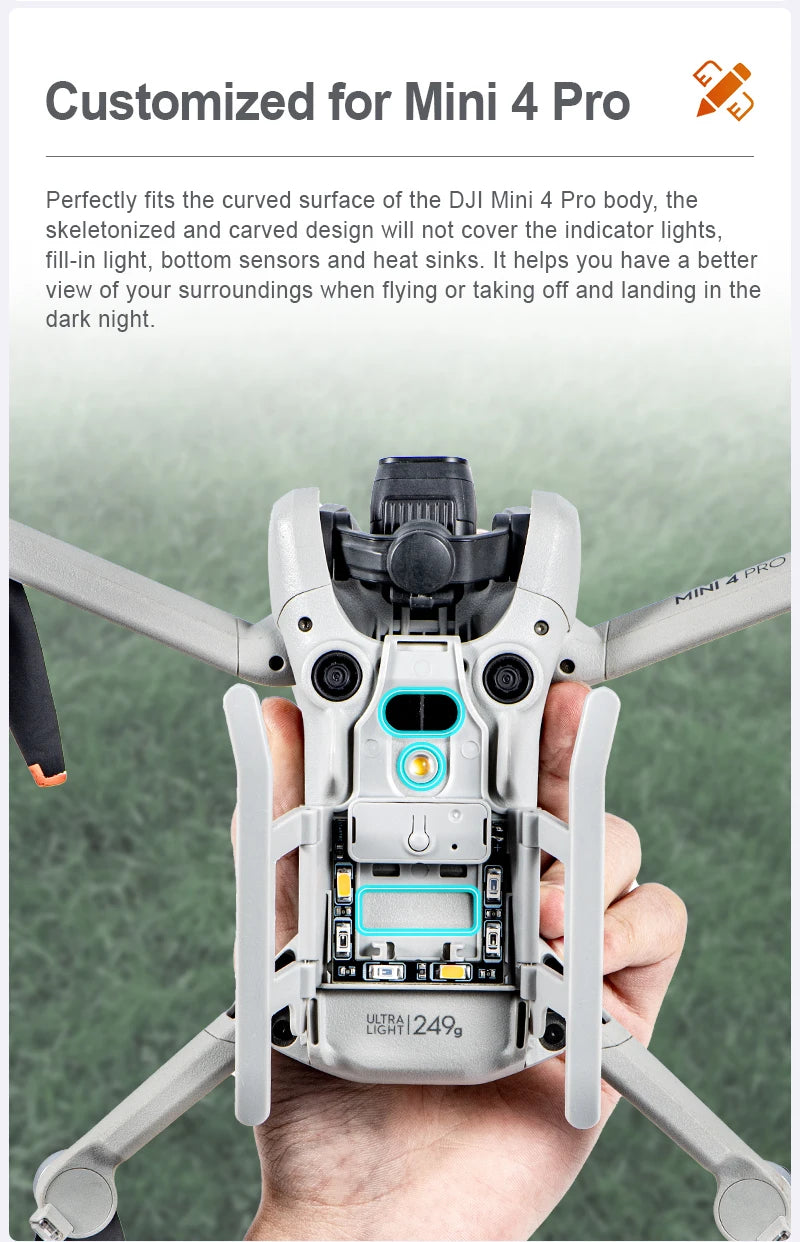 Double Protection: Landing gear can make your drone 17mm higher than the ground, preventing ground debris or water stains from contaminating or damaging the drone body, gimbal and propeller. The hollow design will not block the power indicator, bottom sensor, and heat dissipation holes. Tailor-made, easy to install and remove, won't wobble or fall off during flight
