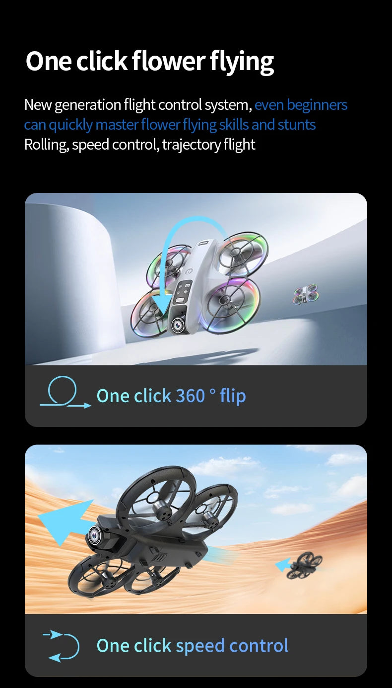 Special functions: Infrared obstacle avoidance gravity sensing trajectory finger painting 2.4G signal stunt roll,Speed switch Mobile phone control - one-click takeoff and one-click landing,Optical flow positioning/Four-sided obstacle avoidance and storage type remote air pressure fixed height high-definition image transmission,Brushless motor/electric lens/horizontal shooting/vertical shooting/overhead shooting /,Real-time image transmission screen remote control