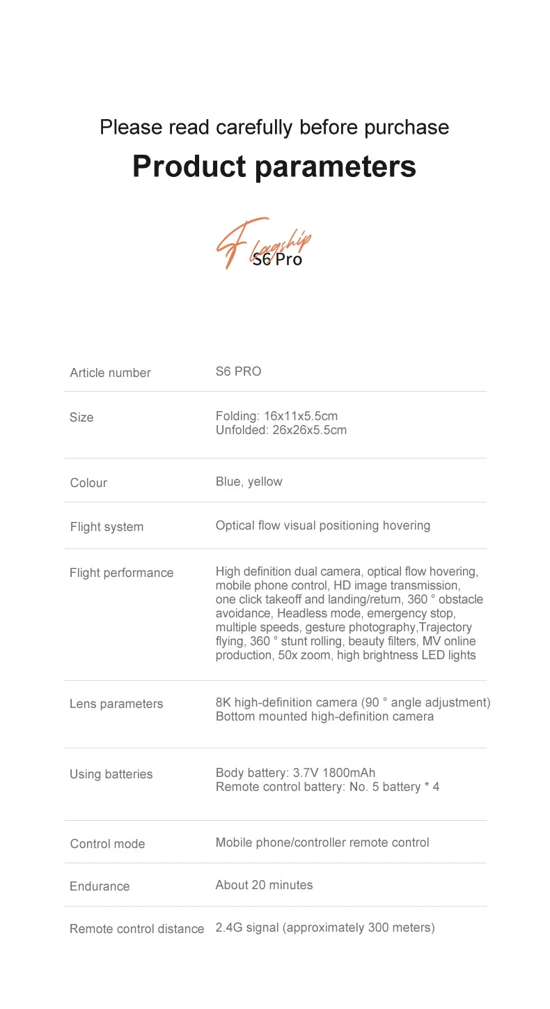Complete configuration: 1. Aircraft * 1 2. Remote control * 1 3. Wind blades * 2 4. Protective bracket * 4 5. Screwdriver * 1 6. Battery (3.7V 1800mAh) 7. Charging cable * 1 8. Chinese and English manual * 1 9. Chinese and English APP download instructions * 1